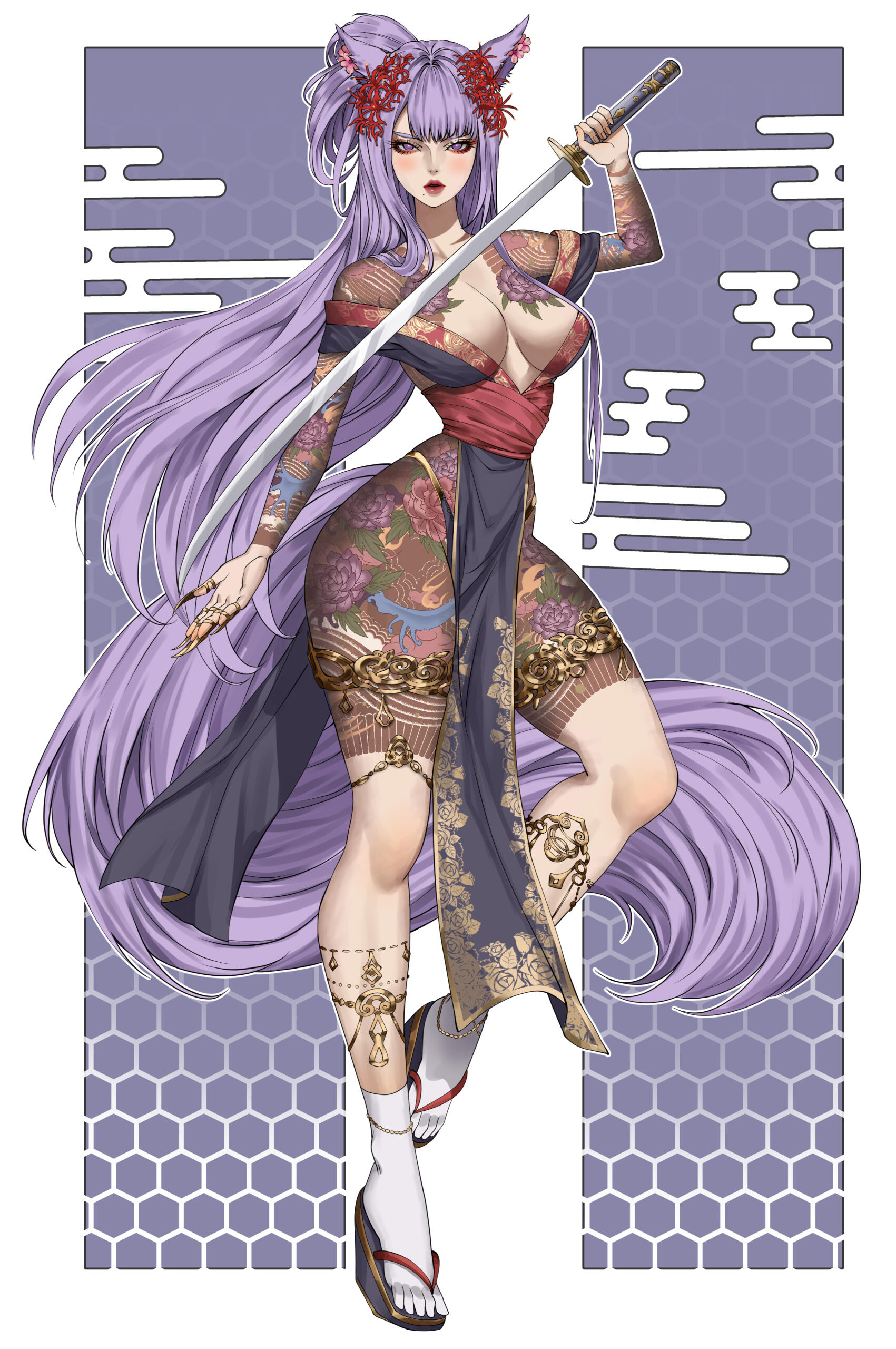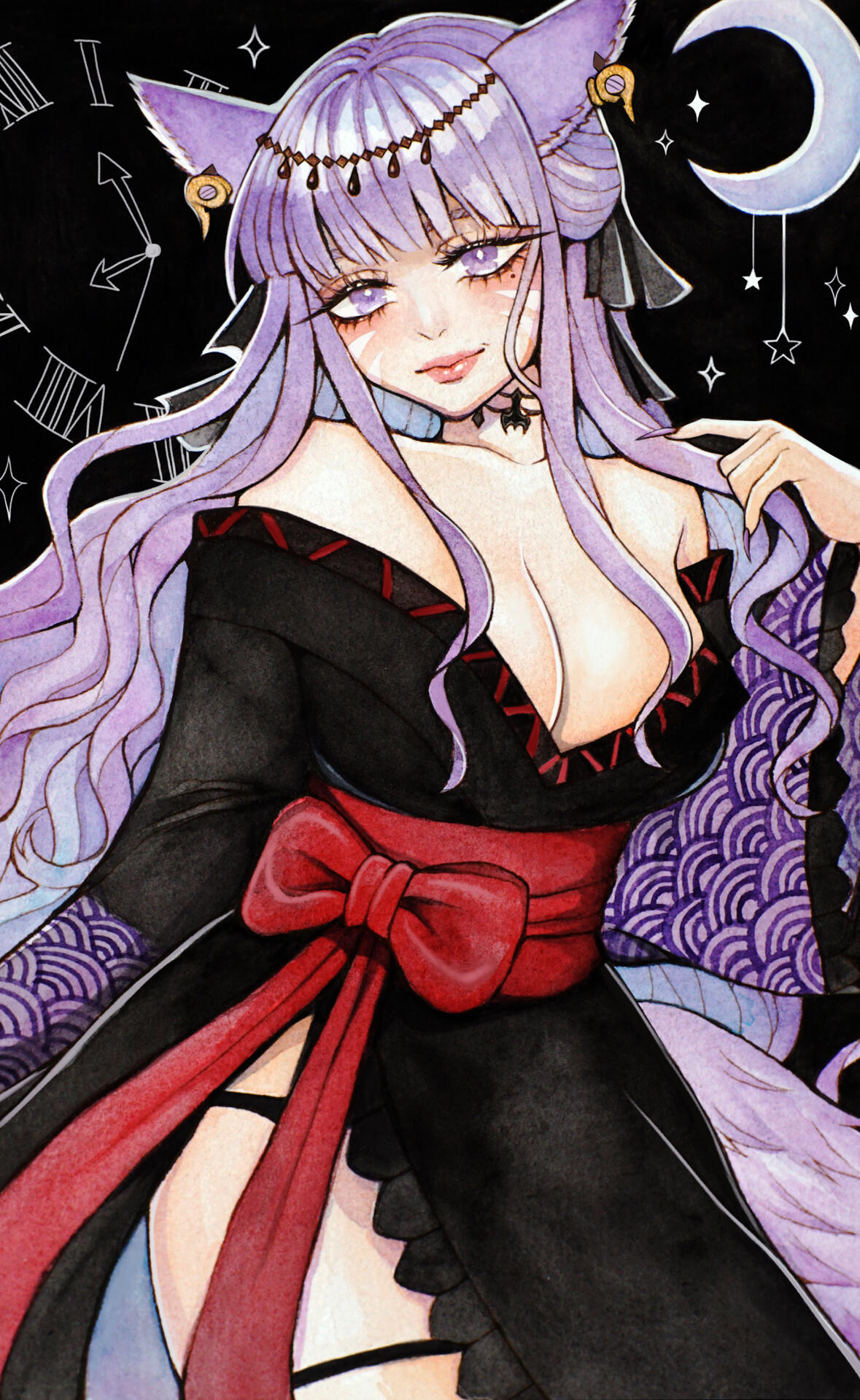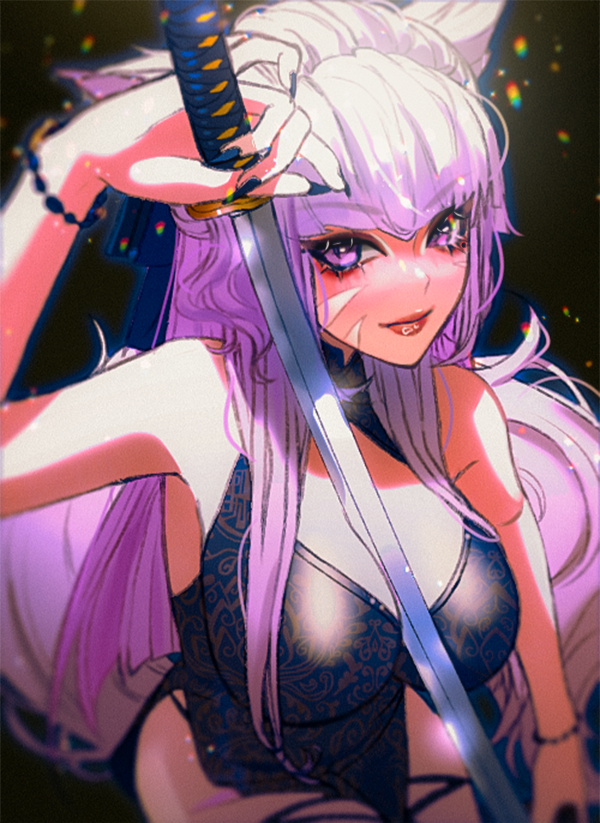 A sudden tragedy tore Lunae’s memories from her, leaving her spirit fractured and her identity adrift. Once blessed by Tsukuyomi and gifted with the ability to navigate the delicate threads of time, Lunae now finds herself stripped of those powers and haunted by visions that are no longer under her control. Where she once brought peace to restless souls, she is now besieged by their agonized cries, her spiritual intuition heightened to the point of agony.As the Kage Miko of her clan, Lunae’s duty was to serve as the shadow that guides lost souls to their final rest. But now, with her mind a battlefield and her visions unpredictable, she struggles to fulfill her role. The spirits come to her in confusion and rage, their unresolved deaths reflected in her own fragmented psyche. Each vision she experiences is a brutal reminder of what she has lost, leaving her to navigate the world through intuition and muscle memory, her past a hazy, unreachable dream.Will she unravel at the seams? Time will only tell.Mugen no YūutsuIn the aftermath of her loss, Lunae has become a creature of contradictions—volatile, unpredictable, and dangerous. Where once she balanced between darkness and light, she now revels in the chaotic freedom of her shattered psyche. Her inner turmoil has manifested in an unquenchable thirst for violence, finding a grim, almost perverse joy in the suffering of others. Torture, bloodshed, and the macabre have become both her weapons and her solace, as if each act of brutality is a desperate bid to reclaim the fragments of her soul.Her hedonistic tendencies have deepened, pulling her into the embrace of excess and debauchery. Lunae dives headfirst into the sensory delights of the Yakuza lifestyle—pleasure, pain, and everything in between—desperately seeking meaning in the madness that now defines her world. To her subordinates, she appears the very image of an unhinged empress, wielding her power with an erratic but terrifying grace.For Lunae Kaneshiro, the line between predator and prey, salvation and damnation, has never been so thin. And in the darkness, the Lavender Lady reigns supreme, her madness the only constant in a world that has spiraled out of control.