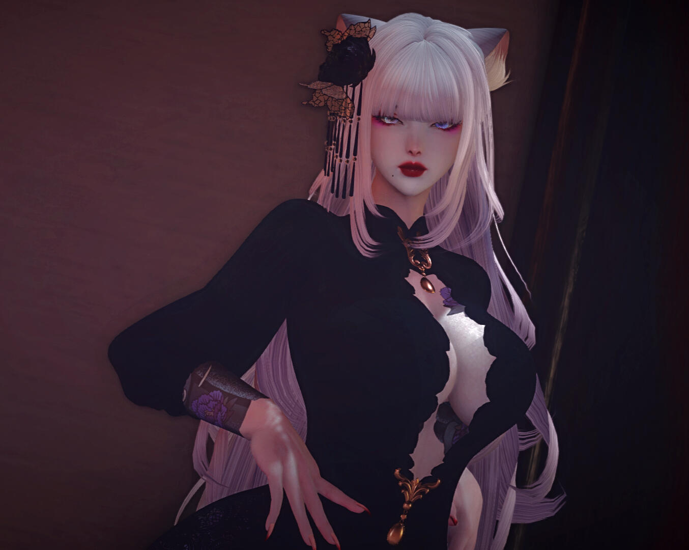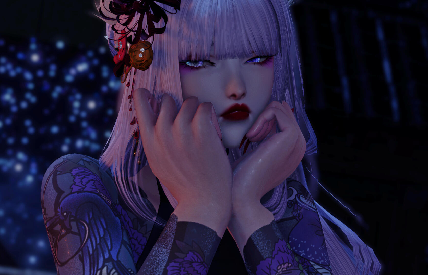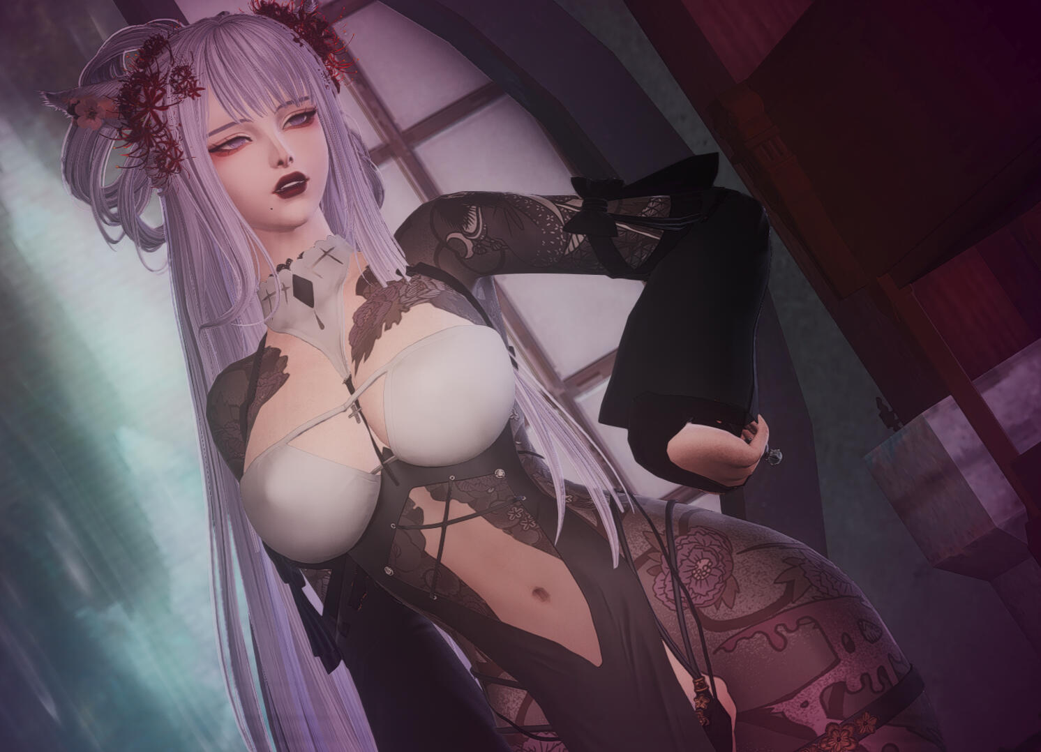 A sudden tragedy tore Lunae’s memories from her, leaving her spirit fractured and her identity adrift. Once blessed by Tsukuyomi and gifted with the ability to navigate the delicate threads of time, Lunae now finds herself stripped of those powers and haunted by visions that are no longer under her control. Where she once brought peace to restless souls, she is now besieged by their agonized cries, her spiritual intuition heightened to the point of agony.As the Kage Miko of her clan, Lunae’s duty was to serve as the shadow that guides lost souls to their final rest. But now, with her mind a battlefield and her visions unpredictable, she struggles to fulfill her role. The spirits come to her in confusion and rage, their unresolved deaths reflected in her own fragmented psyche. Each vision she experiences is a brutal reminder of what she has lost, leaving her to navigate the world through intuition and muscle memory, her past a hazy, unreachable dream.Will she unravel at the seams? Time will only tell.Mugen no YūutsuIn the aftermath of her loss, Lunae has become a creature of contradictions—volatile, unpredictable, and dangerous. Where once she balanced between darkness and light, she now revels in the chaotic freedom of her shattered psyche. Her inner turmoil has manifested in an unquenchable thirst for violence, finding a grim, almost perverse joy in the suffering of others. Torture, bloodshed, and the macabre have become both her weapons and her solace, as if each act of brutality is a desperate bid to reclaim the fragments of her soul.Her hedonistic tendencies have deepened, pulling her into the embrace of excess and debauchery. Lunae dives headfirst into the sensory delights of the Yakuza lifestyle—pleasure, pain, and everything in between—desperately seeking meaning in the madness that now defines her world. To her subordinates, she appears the very image of an unhinged empress, wielding her power with an erratic but terrifying grace.For Lunae Kaneshiro, the line between predator and prey, salvation and damnation, has never been so thin. And in the darkness, the Lavender Lady reigns supreme, her madness the only constant in a world that has spiraled out of control.